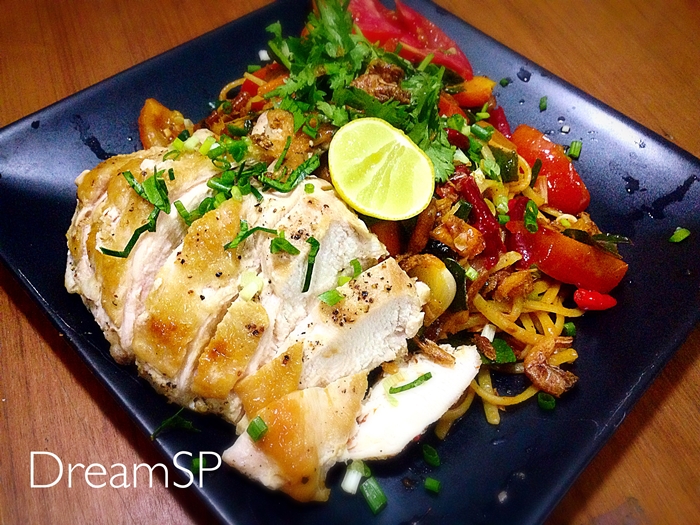 สปาเก็ตตี้ ซอสต้มยำ กับ ไก่ย่าง ทำเองแบบมั่วๆง่ายๆ