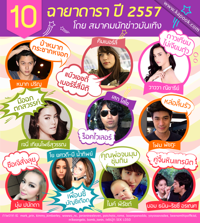 หลังสื่อมวลชนสายบันเทิง 33 สำนัก ประชุมร่วมกันนานกว่า 4 ชั่วโมงเพื่อหาข้อสรุปฉายาดาราประจำปี 2558 ในที่สุดก็ได้ฉายาดาราที่เป็นเอกฉันท์จำนวน 10 รายชื่อ ได้แก่ Cr. http://mcot-web.mcot.net/9ent/view.