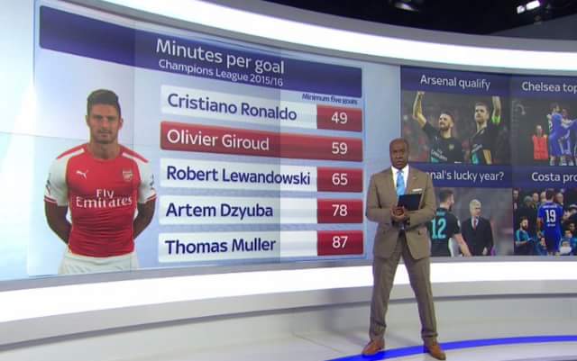 แชมเปี้ยนส์ลีกฤดูกาลนี้ ชิรูด์มีสถิติการยิงประตูเฉลี่ย 1 ประตูในทุก 59 นาที ดีที่สุดรองจากโรนัลโด้