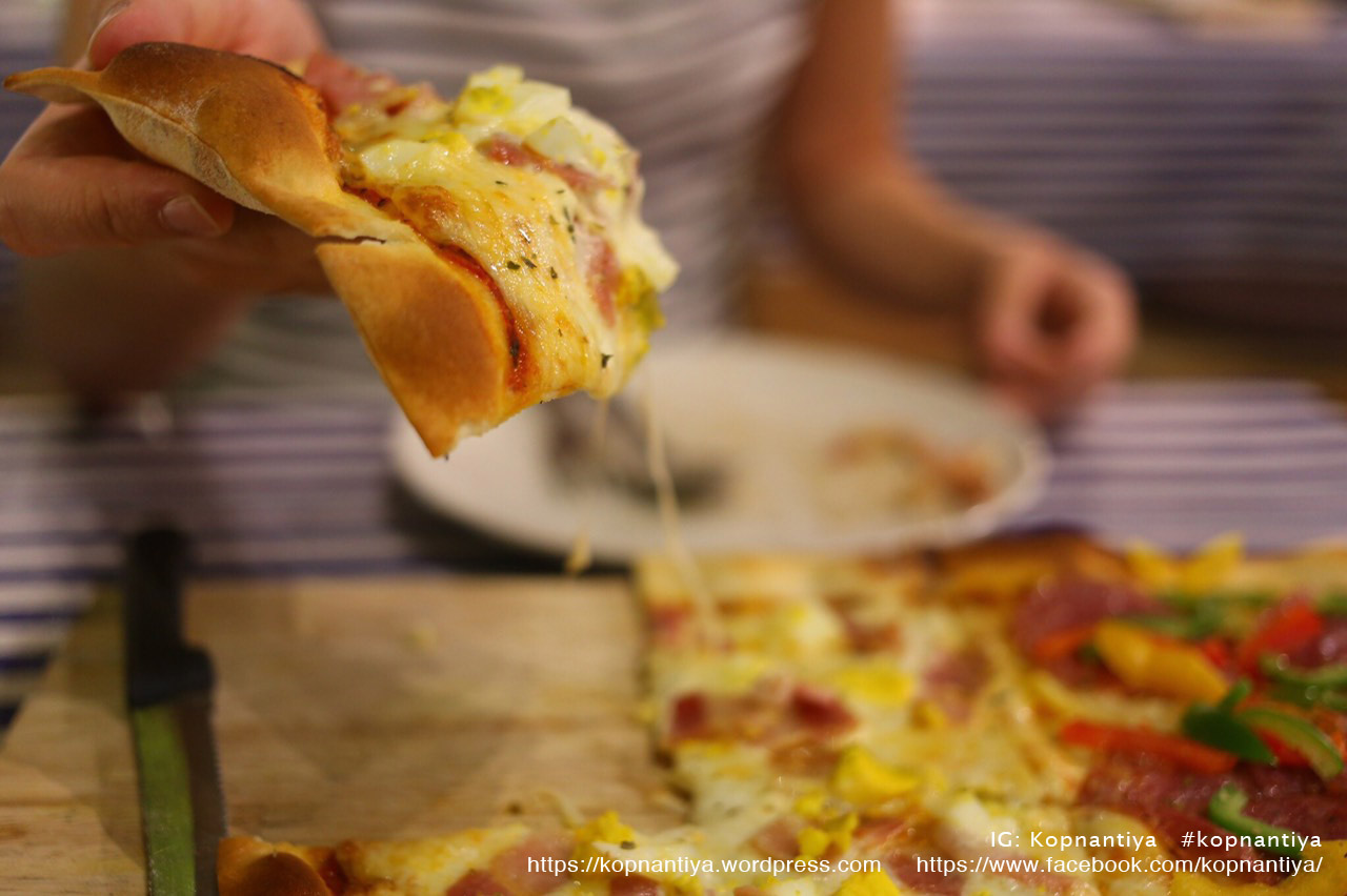 1 พิซซ่า สั่งเเบบ half ได้นะคะ ถาดไม่ใหญ่มาก ทานสองคนได้สบายๆ เราสั่งพิซซ่าคาโบนาร่า half กับพิซซ่าซาลามี่ค่ะ ราคาถ้าจำไม่ผิดน่าจะ 340 บาทค่ะ