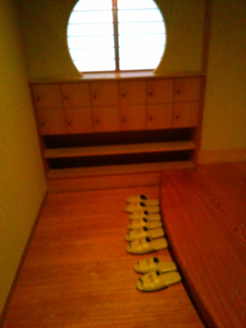 6) เมื่อแน่ใจว่าจะเข้าห้องไหนแล้วจึงเลิกม่านเดินเข้าไป ถอดรองเท้าอย่างที่คนอื่นเขาถอดๆกัน โดยมากจะหันหัวออกตามธรรมเนียม แต่เพราะรองเท้าแตะทุกคนเหมือนกันหมด พยายามจำตำแหน่งรองเท้าของตัวเองไว้ โรงแรมหลายๆแห่งจะมีไม้หนีบติดหมายเลขใส่ตะกร้าไว้ข้างๆ ให้ใช้หนีบรองเท้าแตะของตนแล้วจำหมายเลขนั้นไว้