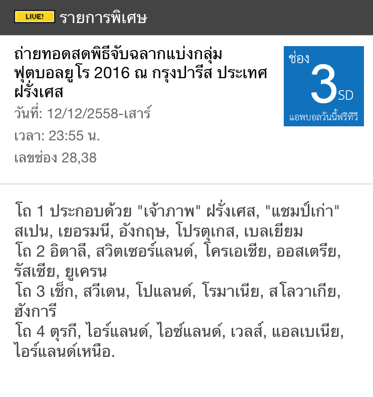 พิธีจับฉลากแบ่งกลุ่มฟุตบอลยูโร 2016 คืนนี้ ฟรีทีวีถ่ายทอดสด