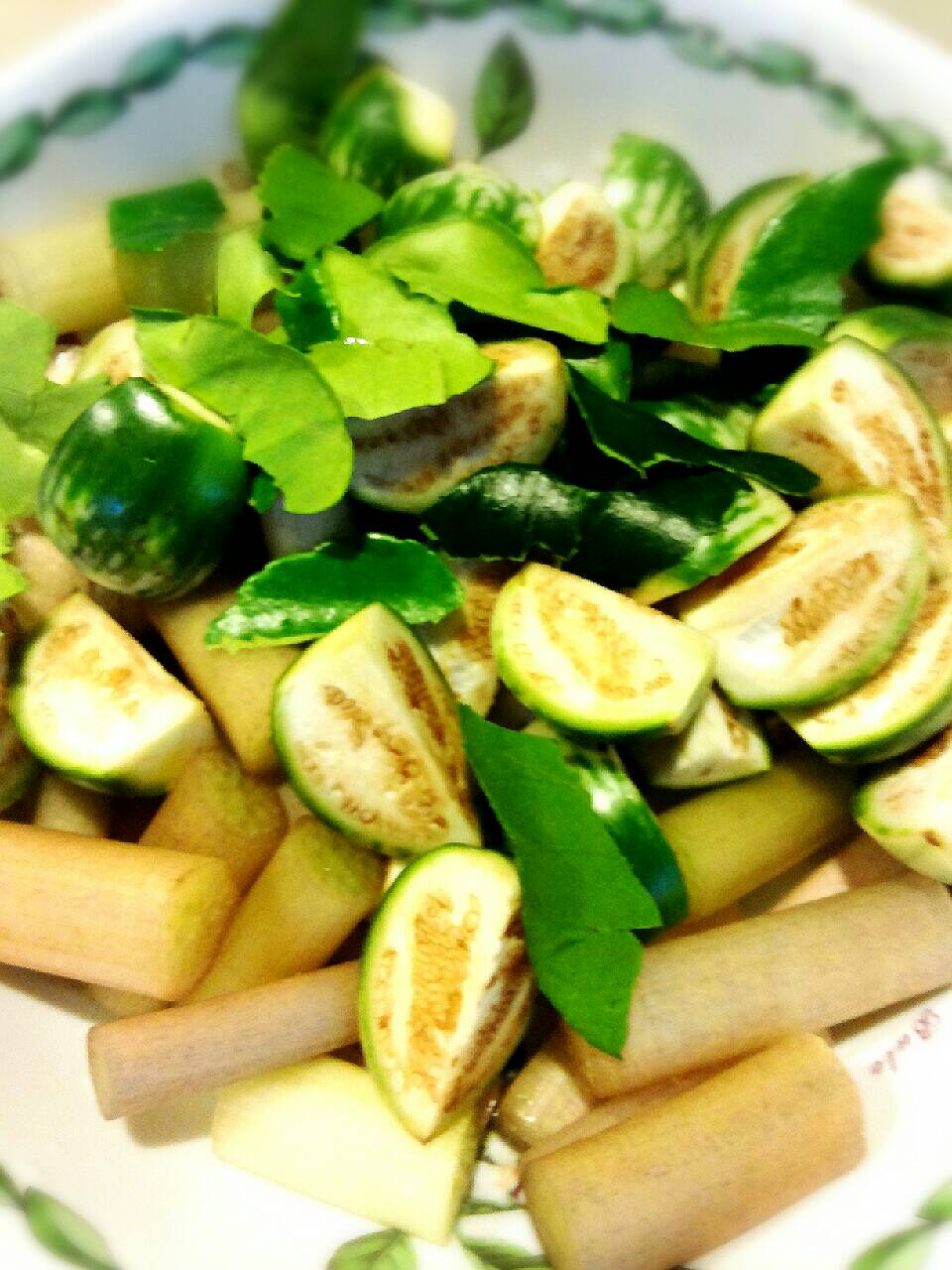 หั่นสายบัว มะเขือ ฉีกใบมะกรูดรอ