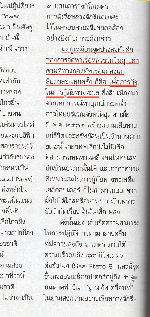 สงสัยว่าฝรั่งมันเกิดไม่ทันหรือไม่ตอนนั้นขนเพิ่งขึ้นเลยไม่ได้ค้นเอกสารเก่า กองทัพเรือแถลงไว้ตั้งแต่เรือยังต่ออยู่ที่อู่สเปนว่าเอาไว้กู้ภัยทางทะเล นิตยสารสารคดีเล่มนี้ผมซื้อเก็บไว้ตั้งแต่ครั้งกระโน้น เรือหลวงจักรีฯ มาถึงภูเก็ตต้นเดือนสิงหาคม 2540 นิตยสารเล่มนี้ออกวางแผงในอีกเดือนถัดมา คงพอเป็นหลักฐานได้ว่ากองทัพเรือไม่ได้แก้เกี้ยวทีหลังว่าซื้อเรือหลวงจักรีฯ มาทำภารกิจกู้ภัย