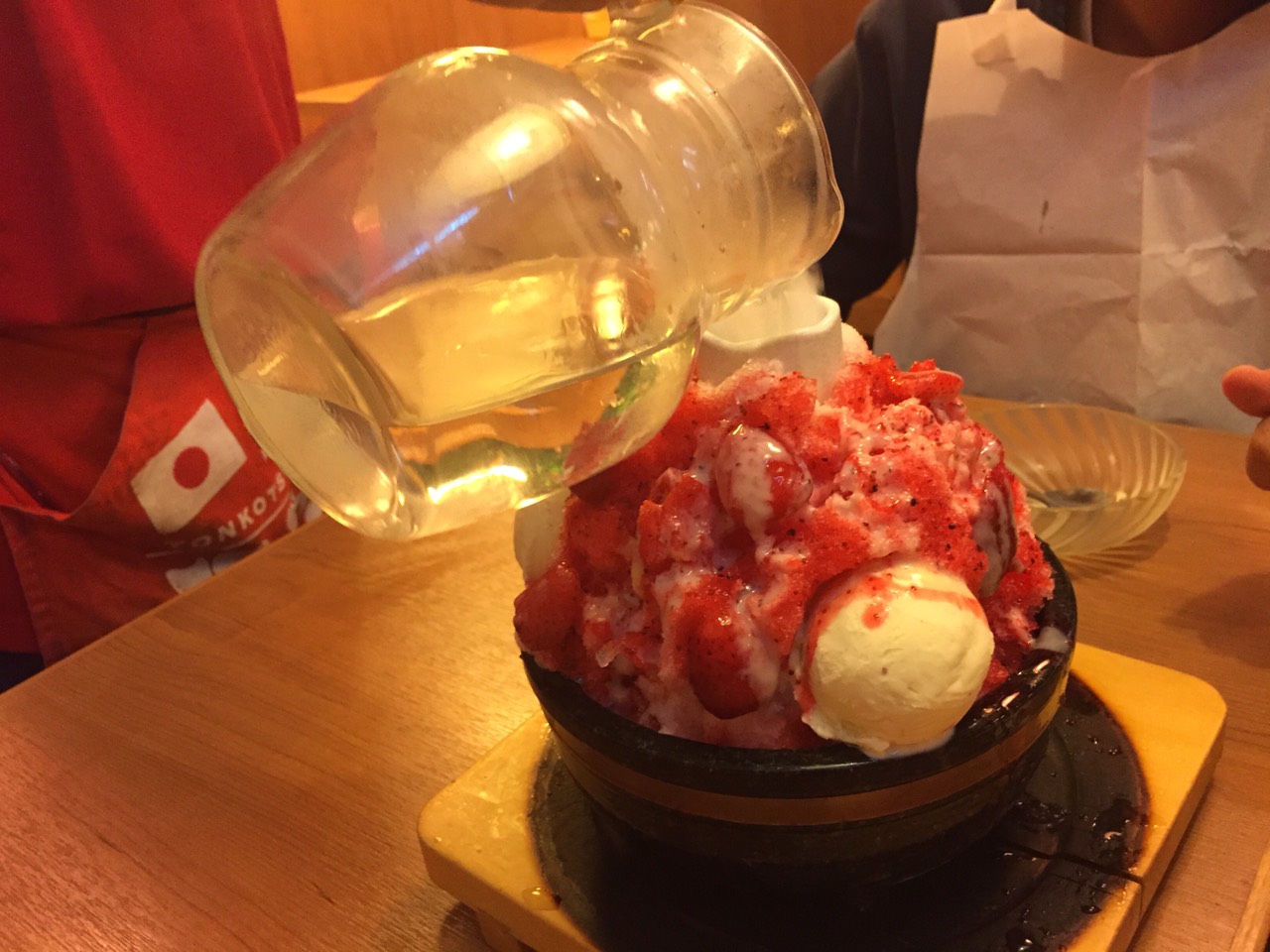 เสิร์ฟมาในหม้อดิน ตรงกลางมีแจกันเล็กๆที่ใส่น้ำแข็งแห้งอยู่ ตอนเสิร์ฟพนักงงานจะเทน้ำเปล่าลงไปก็จะมีควันขึ้นมาเหมือนปล่องภูเขาไฟเลยค่ะ โดยไอศครีมคาซังสตอเบอรี่จะเป็นน้ำแข็งไส โป๊ะด้วยสตอเบอรี่รอบๆ ราดนมข้นหวานและมีไอศครีมวานิลลาโป๊ะมา 2 ลูก เย็นชื่นใจกันเลยทีเดียว อิ่มแปร้เลยค่ะวันนี้