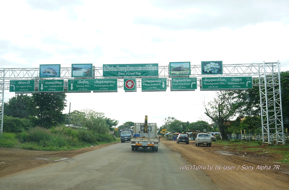 มีป้ายเลี้ยวขวาไปวัดพูมรดกโลกอีก 37 กม. แต่เป็นทางเก่าที่ต้องข้ามแพขนานยนต์