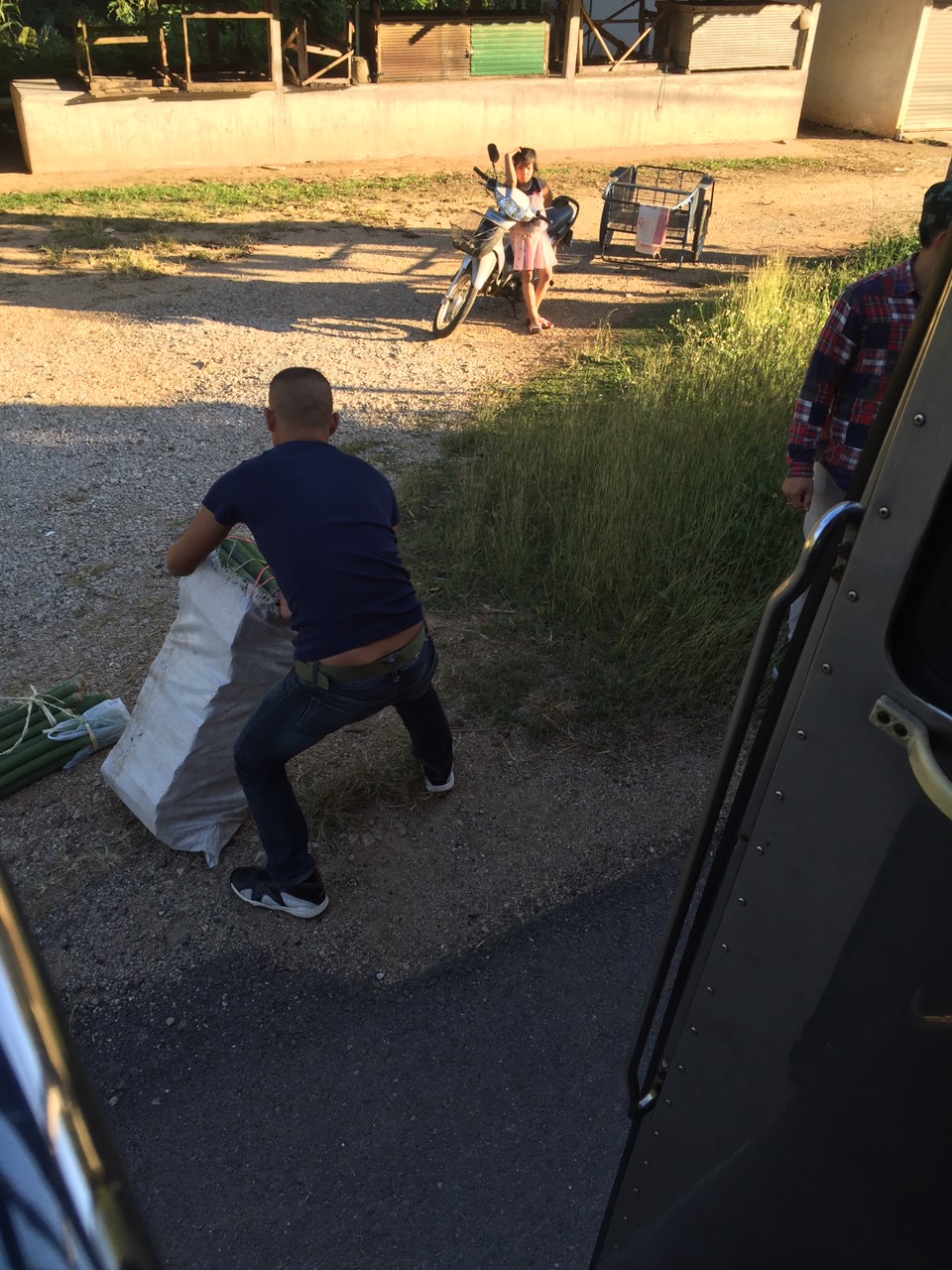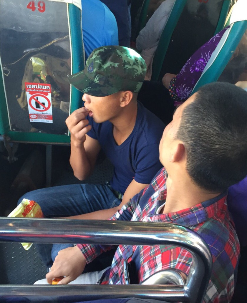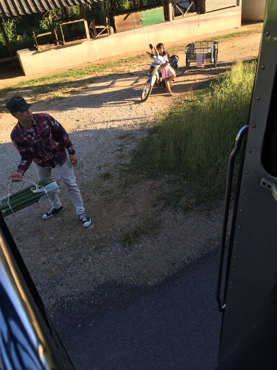พอสักพัก รถจอดข้างทางอีกแล้ว คราวนี้มีคนฝากกระบอกข้าวหลามมากับรถ พี่ทหาร 2 คน ก็ลงไปช่วยยกใส่รถอีกเหมือนเดิม