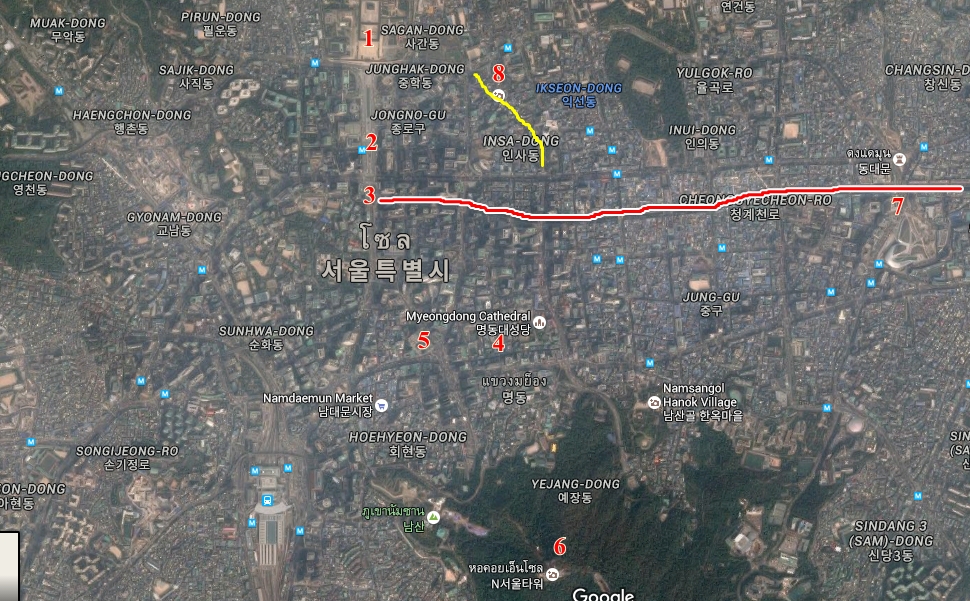 3.คลองชองเก และเส้นสีแดงคือทางเดิน ซึ่งยาวมาก ผ่านทงแดมุนด้วย แต่เดินไกลไม่แนะนำให้เดินค่ะ