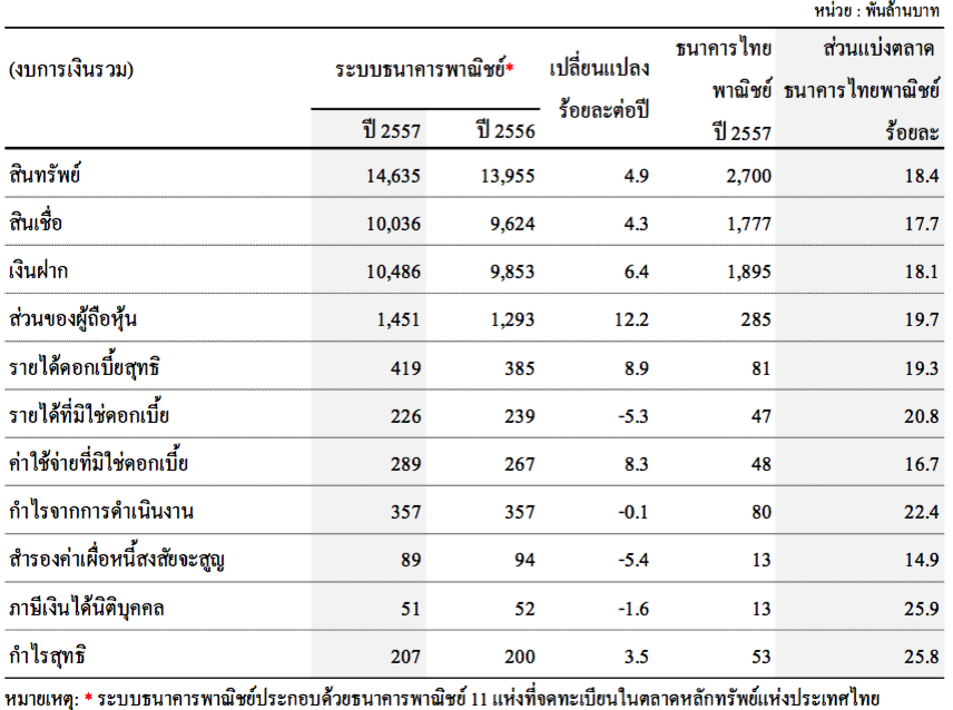 ไทยพาณิชย์ทำตารางเปรียบเทียบกับทั้งตลาดกับรายได้ของตัวเองไว้ด้วยครับ ขอ highlight หน่อยเถอะคือกำไรสุทธิของทุกธนาคารรวมกัน สองแสนล้านบาท ไทยพาณิชย์กดกำไรสุทธิไป ห้าหมื่นกว่าล้านบาทคิดเป็น 25.8% ของทั้งตลาดครับ (ในปี 57)
