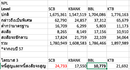 มาดูไตรมาส 3 เทียบกันทั้ง 4 ธนาคารดีกว่า ผมสนใจที่สุดก็คือหนี้จะสูญ หรือ NPL นี่แหละใครเป็นอย่างไรกันบ้าง