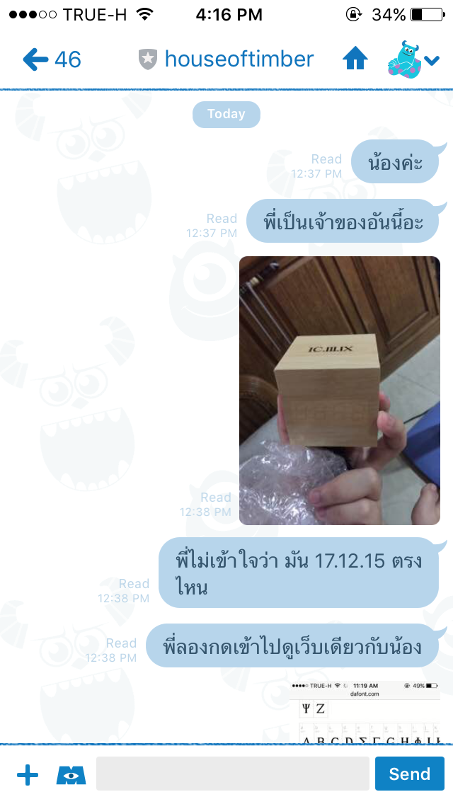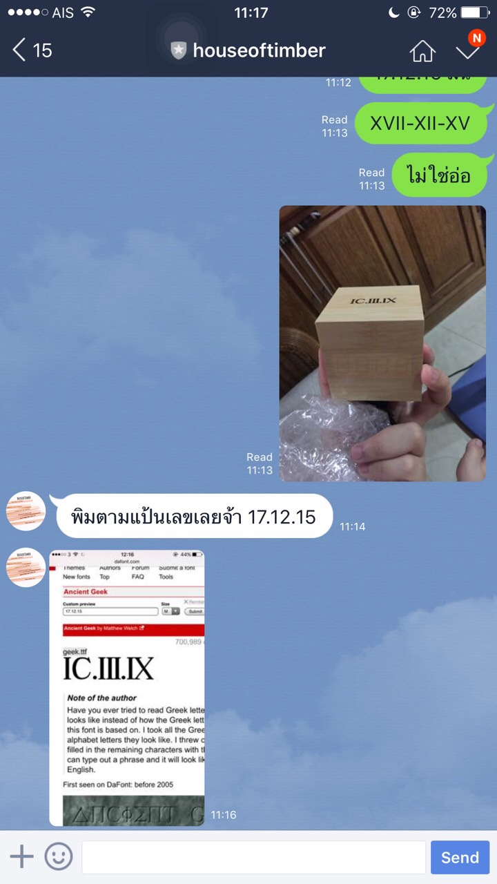 มั่นใจมากๆว่าคงเข้าใจผิด เพราะ X ยังไงก็ไม่ใช่ 5 ทางเว็บคงหมายถึงตัวอักษรที่มีในการเขียนตัวเลขทั้งหมด ทำให้ตอนเจ้าของร้านไปเขียนเลยเป็น "IC.III.IX" ตรง 17 กับ 15 นี่พอรับได้นะค่ะว่าเข้าใจผิด แต่ 12 = III ยังไงมันก็ไม่ใช่อ่าาาา มันก็ make sense อยู่นะคะเรื่องปกติธรรมดาเจอได้ทั่วไป บวกกับว่าพอลองนำนาฬิกาไปชาตเสียบกับคอม พอถอดออกก็ไม่มีไฟแต่อย่างใดมีไฟเฉพาะเวลาที่เสียบอ้าวไหนบอกชาตได้ล่ะ ??? นี่เลยเดือดเลยจ่ายตังไปค่านาฬิกา 650 ค่าแกะสลัก 300 ที่ได้มาคือไม่ตรงตามความต้องการเลย จขกท เลยไลน์ไปหาทางเจ้าของร้านเองเลย