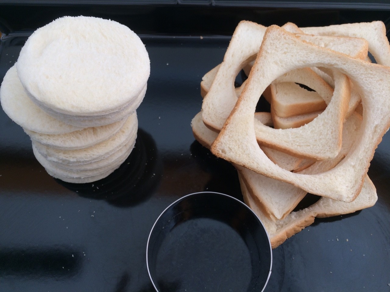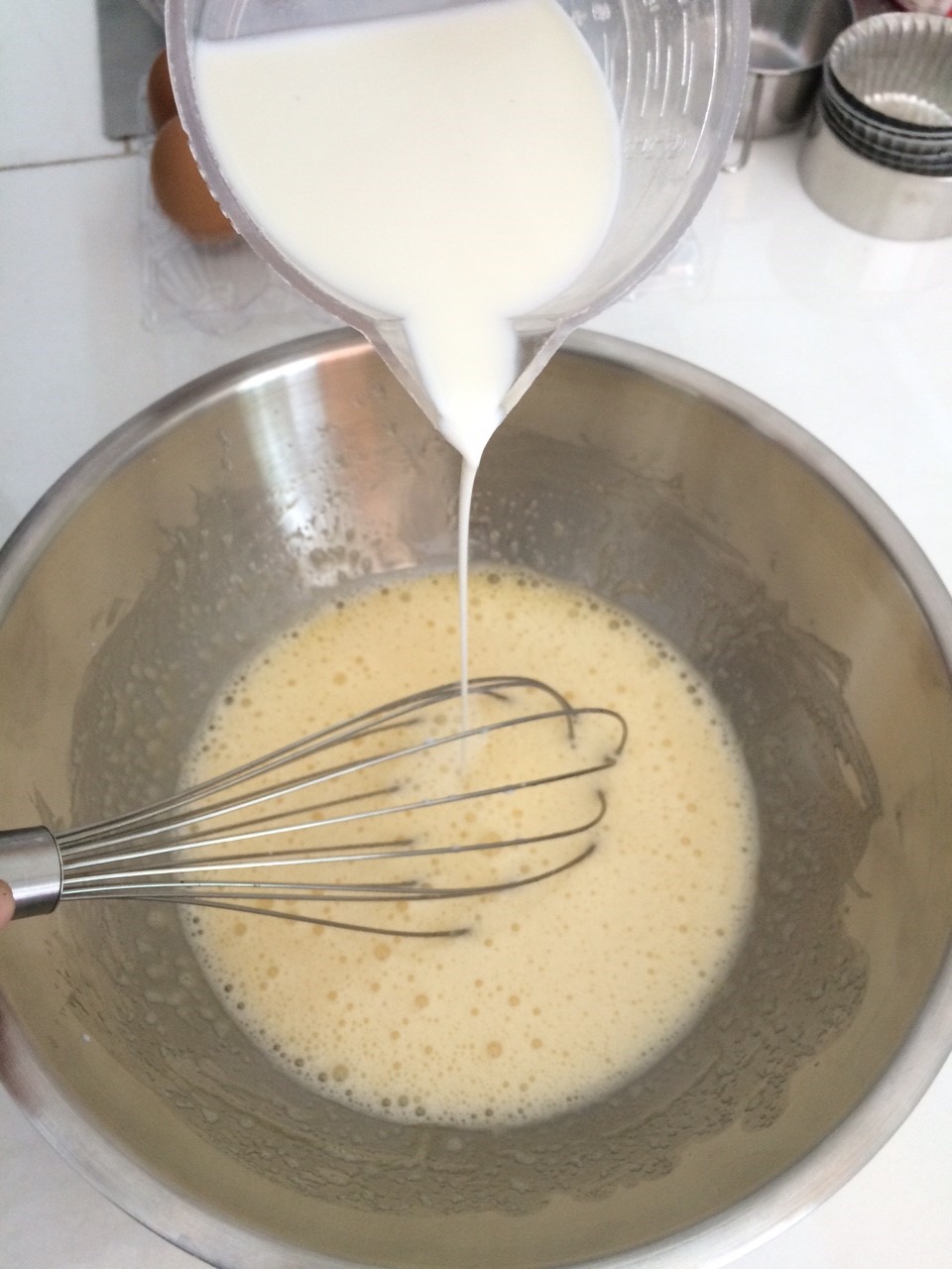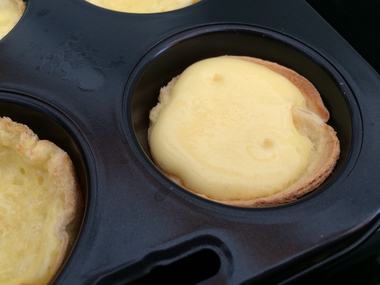 เมื่อกดปุ่มวอร์ม เตาแล้วผสมไข่ นม น้ำตาลและกลิ่นวานิลาเข้าด้วยกัน ตัดขนมปังเป็นแผ่นกลมเพื่อใช้รองพิมพ์ ใช้ไม้นวดแป้งคลึงๆ ใส่เข้าไปในพิมพ์ แล้วก็เทส่วนผสมที่ตีแล้วลงพิมพ์หรือหลุมถาดค่ะ อย่าใส่ส่วนผสมเกินขอบขนมปังนะคะ