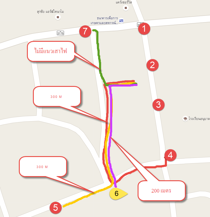 ข้อที่ 2. ทำไมไม่ติดเพิ่มในซอยบ้านของผมสัก 1 จุด ในบริเวนจุดที่ 6 ที่ผมเพิ่มไปในรูปภาพก็ได้ครับ จะมีระยะสายพอดี 200 เมต หรือเกิน มานิดหน่อยก็จะยอมจ่ายครับ เพราะจากระยะจากจุดที่ 4 และ 5 แล้ว ในซอยบ้านของผมไม่มีบ้านไหนแทบจะติดตั้งได้เลย