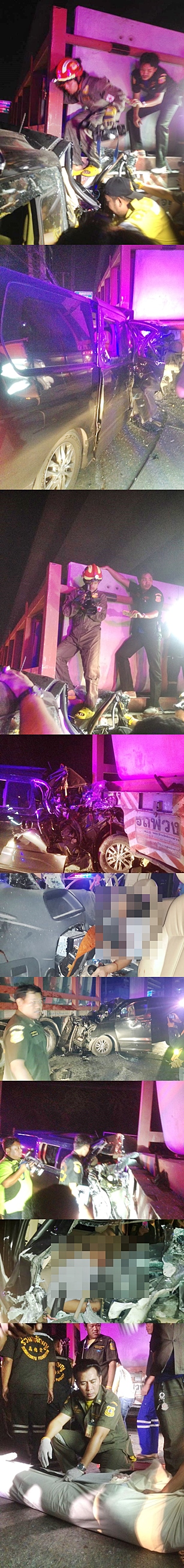 ที่เกิดเหตุพบรถพ่วง 22 ล้อ ยี่ห้อ ฮิโน่ สีขาว ทะเบียน หัวพ่วง 70-1475 พระนครศรีอยุธยา ห่างพ่วง 70-1628 พระนครศรีอยุธยา จอดอยู่กลางถนน ที่บริเวณท้ายรถข้างซ้ายมีรถยนต์ตู้ยี่ห้อ ฮุนได รุ่นเอช 1 สีดำ ทะเบียน ฮล 4983 กรุงเทพมหานคร ชนติดอยู่ด้านท้ายในสภาพด้านหน้าพังยับเยิน ภายในรถตู้คันดังกล่าวได้พบร่างของนายสิทธิพงศ์ คงสง อายุ 38 ปี พนักงานบริษัทแห่งหนึ่งซึ่งเป็นคนขับถูกโครงเหล็กตัวถังรถอัดติดเสียชีวิตอยู่ภายในรถ ในสภาพคอหัก คางฉีก ขาติดอยู่กับคอนโซลหน้ารถ ด้านฝั่งคนนั่งพบร่างของนายฉัตรชัย ฉัตรคู่ อายุ 38 ปี มีแผลฉีกขาดที่บริเวณหน้าผาก ศีรษะด้านหลังแตก และหมดสติ อาการสาหัส เจ้าหน้าที่มูลนิธิได้นำเครื่องตัดถ่างมานำร่างนายฉัตรชัย ออกมาได้ก่อนรีบนำส่งโรงพยาบาลสมุทรปราการ