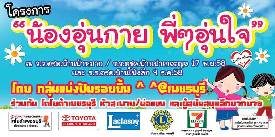 ีและอีกมากมายทั้งเบื้องหน้าและเบื้องหลัง คงยากที่จะกล่าวถึงได้ทั้งหมด พื้นที่นี้คงไม่พอ แต่ทุกท่านล้วนแต่มีจิต เมตตา และเล็งเห็นคุณค่าแห่งการแบ่งปัน นับจากเมื่อเริ่มประชาสัมพันธ์ข่าวกิจกรรมนี้ออกไปก็ได้รับน้ำใจให้น้องๆอย่างไม่ขาดสาย