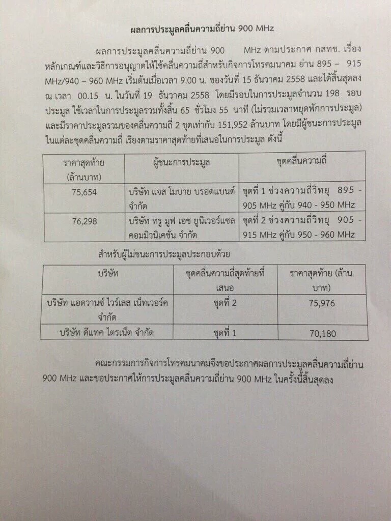 JAS ชุดที่ 1 คลื่น 895-905 MHz คู่กับ 940-950 MHz (10 MHz) มูลค่าการประมูล 75,654 ล้านบาท TRUE ชุดที่ 2 คลื่น 905-915 MHz คู่กับคลื่น 950-960 MHz (10 MHz) มูลค่าการประมูล 76,298 ล้านบาท อายุใบอนุญาต