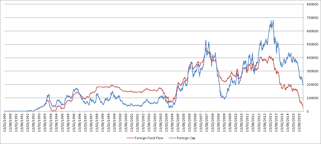หมายเหตุ : ข้อมูลนี้เป็นการวิเคราะห์นี้ มาจาก eFin ซึ่งรวบรวมข้อมูลการซื้อขายของต่างชาติตั้งแต่ปี 1992 แต่ตลาดหลักทรัพย์เปิดเมื่อปี 1975 ดังนั้น ข้อมูลอาจจะไม่สมบูรณ์