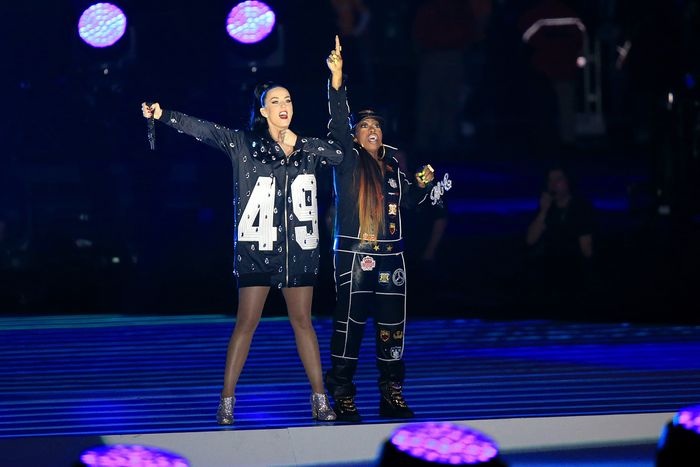 การแสดงของ Katy Perry และ Missy Elliott ที่โชว์บนเวทีของงาน Pepsi Super Bowl XLIX Halftime Show ที่ University of Phoenix Stadium เมื่อวันที่ February 1, 2015. Glendale, Arizona.