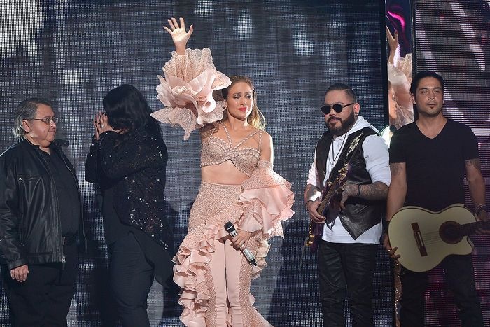Jennifer Lopez and Los Dinos onstage after performing musical tribute to Selena at the 2015 Billboard Latin Music Awards on Telemundo at Bank United Center on April 30, 2015 in Miami, Florida.