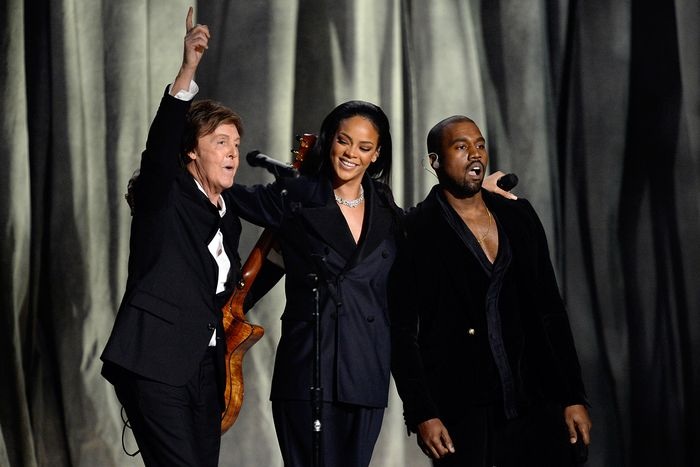Sir Paul McCartney, Rihanna and Kanye West perform onstage during The 57th Annual GRAMMY Awards at the at the STAPLES Center on February 8, 2015 in Los Angeles, California.