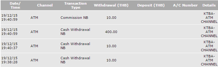 ตามรายการในรูปโดนหักไป 10 บาท ตอนที่ผมกดไปดู "สอบยอดคงเหลือ" โดนหักอีก 10 บาทครั้งที่สองตอนจะกดถอนเงินแต่ตู้ดันขึ้นข้อความว่า "ไม่สามารถถอนเงินได้"