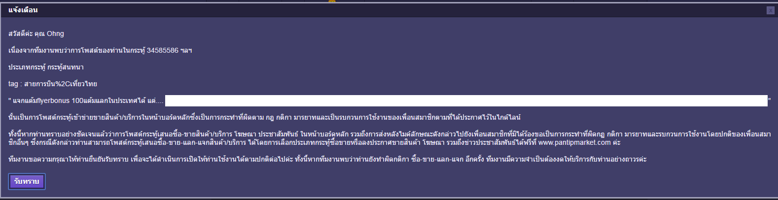 พอดีผมตั้งกระทู้แจกแต้ม flyerbonus ไปแบบผมไม่ได้อะไรเลย คนที่รับไปแค่เสียค่าธรรมเนียมและค่าแลกตามประกาศของสายการบินเอง ซึ่งถูกกว่าจองปกติครึ่งๆเลยทีเดียว แต่ตั้งกระทู้ไม่ถึง 5 นาทีโดนลบแล้วยังมีการแจ้งเตือนอีก