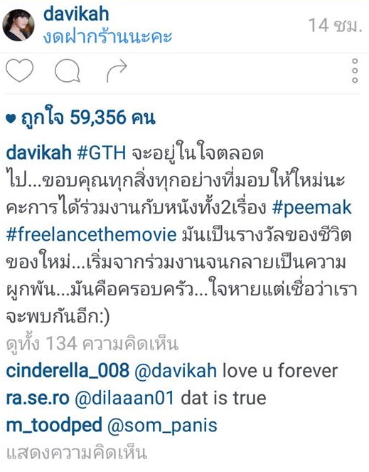 ใหม่ ดาวิกา ลงig ถ่ายทอดความรู้สึกดีๆต่อ GTH