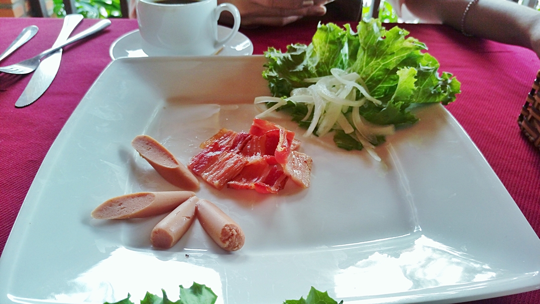 มาตามนัดประมาณเจ็ดโมงสั่งอาหารเหลือเวลาอีกยี่สิบนาที คิดอยู่ว่าเค้าจะทำอาหารทันรึเปล่า เพราะตั้งแต่มาสั่งอาหารมากินนานมากกว่าจะได้ลูกค้าก็ไม่มี ทำกันช้ามาก แล้วจานก็ใหญ่มากด้วย ที่ตะลึงกว่าคือ นี้คืออาหารเช้าที่โรงแรมจัดให้ฟรี ตามที่เราสั่ง