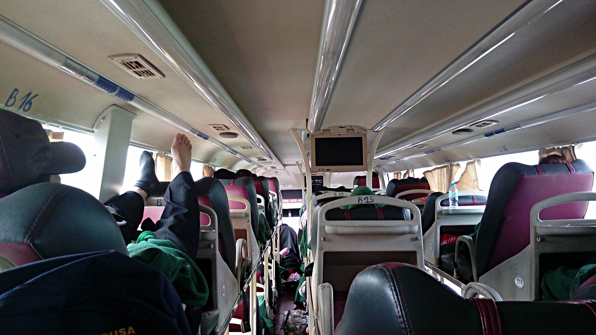รถก็เป็นรถทัวร์นอนเหมือนเดิม เหมือนตอนที่นั่งไปดาลัค ก่อนขึ้นรถต้องถอดรองเท้าใส่ถุงดำที่เข้ามีไว้ให้ เพราะบางคนนอนเอาเท้าพาดเอ้าอี้นอนคนอื่นแบบนั้นก็ไม่ไหว