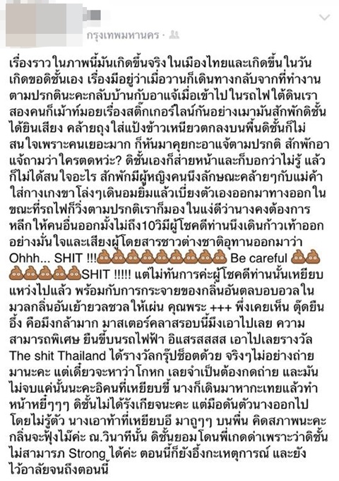 ต่อมาก็ได้ยินเสียงฝรั่งอุทานว่า Oh Shit Be careful Shit แต่ก็ไม่ทัน เพราะมีผู้โดยสารคนหนึ่งเหยียบก้อนอุจจาระไปแล้ว เท่านั้นแหละ คนในรถไฟฟ้าก็แตกฮือกระจายไปคนละทิศละทาง พร้อมทั้งเสียงวิพากษ์วิจารณ์กันกระหึ่มว่าใครทำปล่อยอุจาระออกมากลางรถไฟฟ้าแบบนี้