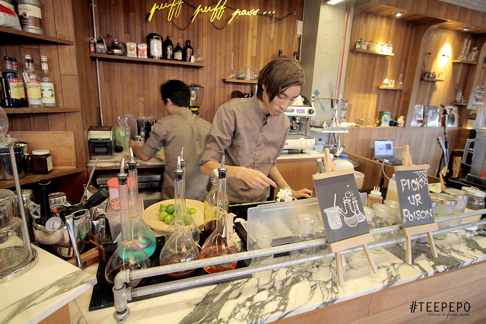 หน้าบาร์ก็จะมีการทำเป็นจำลองวิทยาศาสตร์ ซึ่งต้องบอกว่าเค้ามีเมนูแบบวิทยาศาสตร์ด้วยนะ