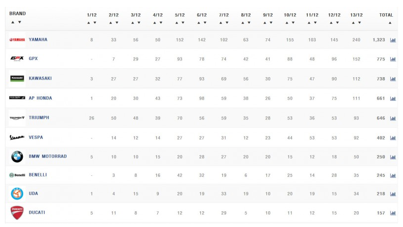 อันดับที่10 คือ Ducati จัดราคามาแบบเอื้อมถึงกันได้ง่ายขึ้น ด้วยราคาไม่เกินสามแสนบาท ซึ่งนับว่าเป็นรถคันแรกของทางค่ายในเจนนี้ที่มีเรทราคาอยู่ในช่วงนี้ อย่างไรก็ตามแม้ว่ายอดรวมทั้งหมดจะอยู่ที่ 157 คัน แต่ก็ถือว่าน่าพอใจ เพราะราคารถแต่ละคันนั้นถือว่าไม่ธรรมดาเลยทีเดียว