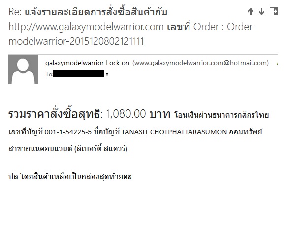 เรื่องมีอยู่ว่าผมได้ทำการสั่งโมเดลจากร้านนี้ ก่อนสั่งผมติดต่อไปทาง Line ของร้านเพื่อถามสินค้าว่ามีพร้อมสั่งหรือไม่ เพื่อเอาชัวร์ เพราะบอกตามตรงว่าหน้าเว็บโบราณมาก ก็ได้คำตอบมาว่า จะเช็คให้ และสักพักก็มีเมล์ตอบกลับมาว่า มีสินค้า มีปล.ลงท้ายว่า "โดยเหลือเป็นกล่องสุดท้าย"