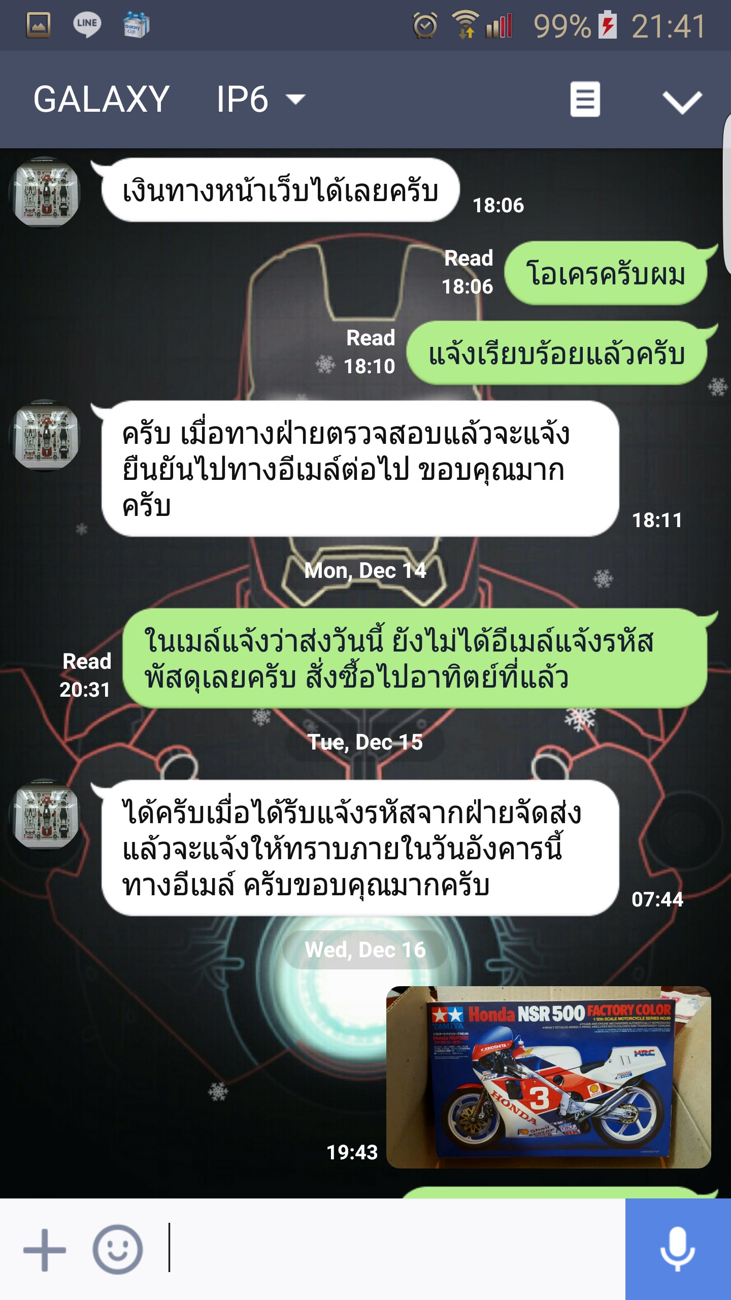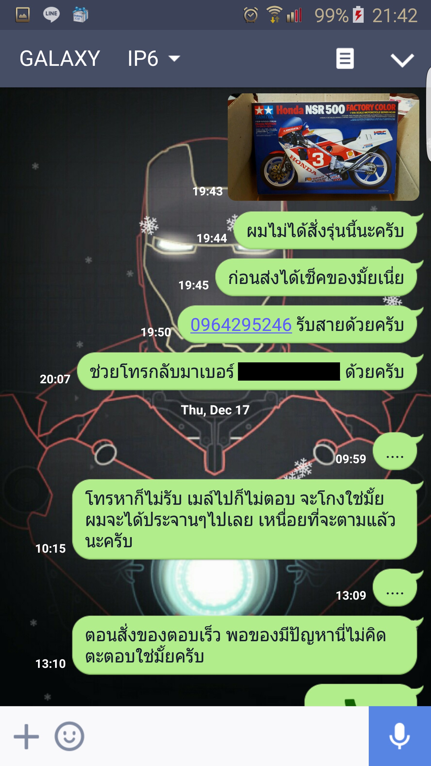 ผมไม่ได้สั่งคันนี้ แล้วก่อนสั่ง ผมถามย้ำแล้ว มีของมั้ย ? แล้วนี่คือการเช็คว่ามีของแล้วส่งอะไรมา ? พยายามคิดในแง่ดีว่ามันคงส่งผิดจริงๆ ก็เลยติดต่อไปในไลน์ แต่ก็ตามภาพ ไม่ตอบ ไม่อ่าน (ทีตอนขายของตอบเอาๆ) ผมติดต่อไปทุกทางที่ร้านมันลงไว้ โทรก็แล้ว เป็นสิบๆสาย โทรทั้งวัน ฝากข้อความก็แล้ว เมล์ก็ส่ง สรุปยันวันนี้ 25 ธ.ค. 58 เงียบกริป ไม่มีแม้จะโทรกลับหรือตอบอะไรกลับมา ก็เอาเถอะ สรุปคือโกงกันหน้าด้านๆแบบนี้ เสียเงินไม่เท่าไหร่ แต่โคตรเสียความรู้สึก อุส่าดีใจเจอรุ่นที่หามานานสักที แล้วทำกันแบบนี้...