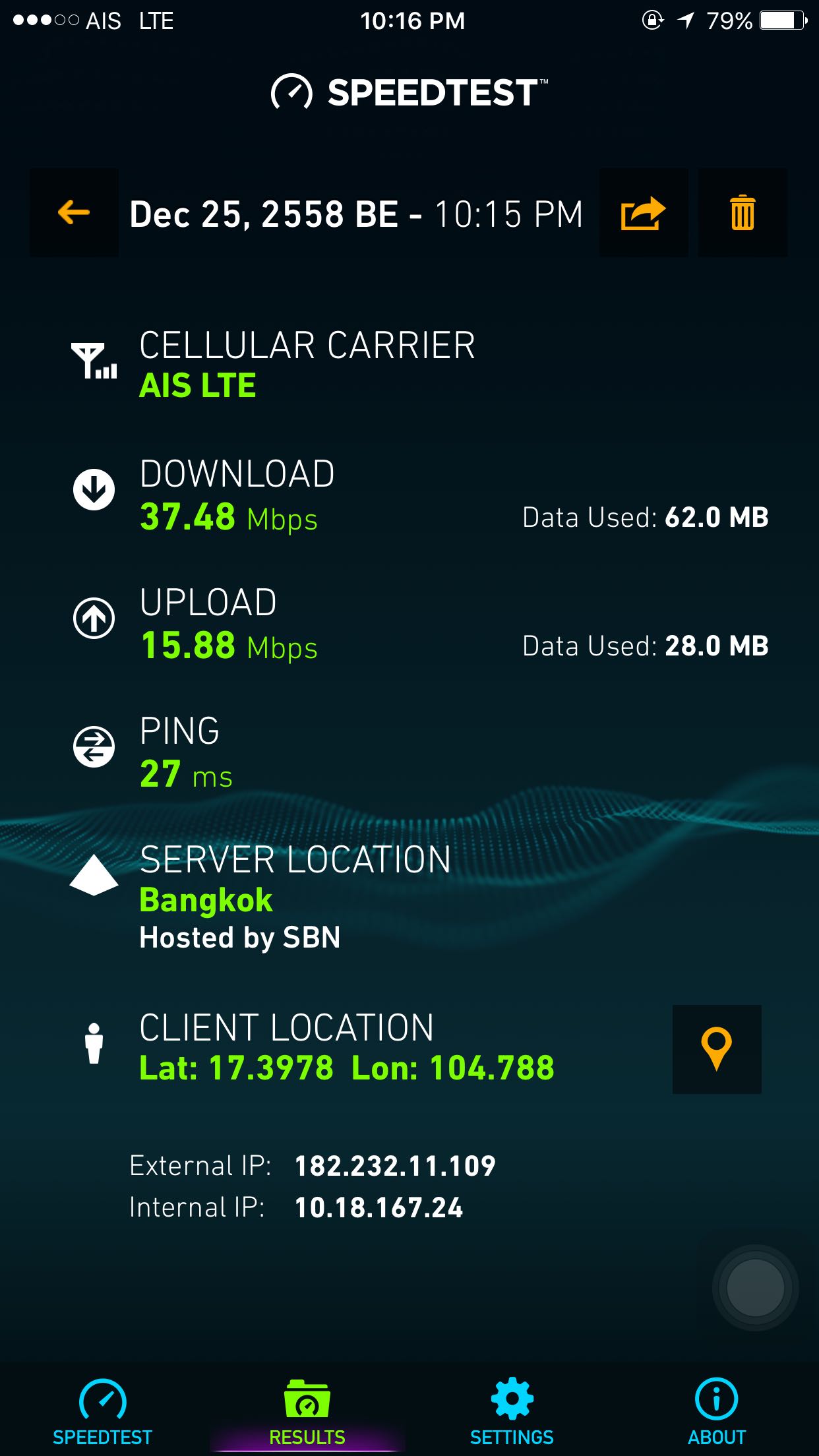 ผมอาศัยบนตึกอาจจะอับสัญญาณเล็กน้อย ได้ประมาณ 3 ขีดสัญญาณ แต่ไม่หลุดจาก LTE เลยครับ เทสสปีดออกมาก็ได้ประมาณเท่าที่เห็นนี่ล่ะครับ นี่พึ่งช่วงทดลองใช้ ก็เป็นที่น่าพอใจสำหรับผม ความเร็วอาจจะไม่แตกต่างจากทาง Truemove H แต่สัญญาณนิ่งกว่าอย่างเห็นได้ชัดครับ ไม่สลับไปมาเหมือน Truemove H ครับ