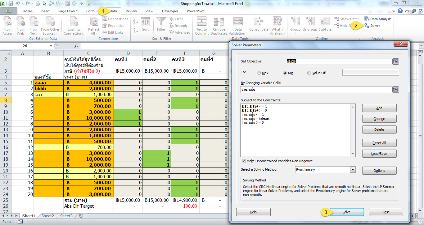 ผมก็เลยทำโปรแกรมช่วยวางแผน Shopping ที่มี จุดมุ่งหมายคือ ให้แต่ละคนซื้อของได้ใกล้เคียงรายได้สุทธิตัวเองที่ 15000 ให้มากที่สุด!!