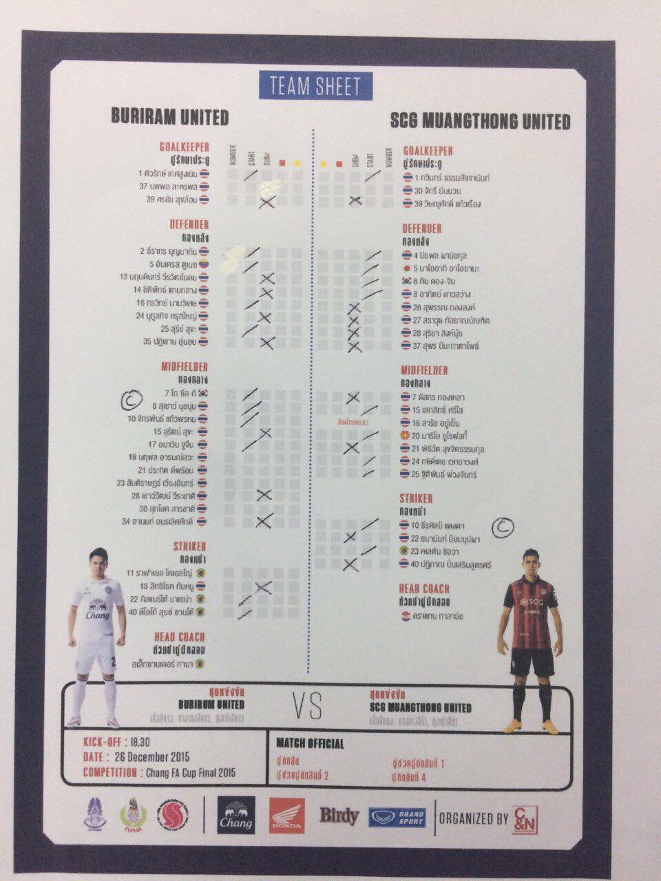 บุรีรัมย์ ยูไนเต็ด VS เมืองทอง ยูไนเต็ด รายชื่อ ช้าง เอฟเอคัพ 2015