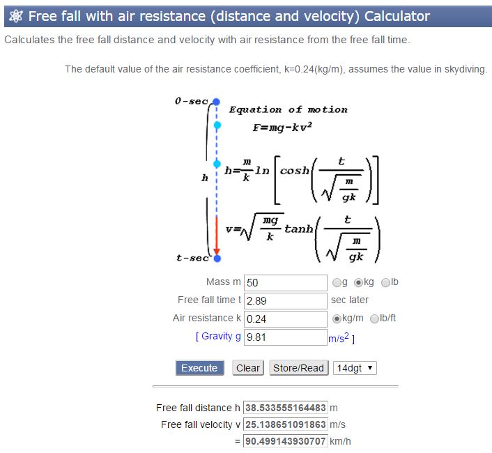 ความเร็วตอนถึงพื้น = SQRT (2 x g x h) = SQRT ( 2 x 9.81 x 40) = 27.66 m/s = 100 km/hr ไม่คิดแรงต้านอากาศ