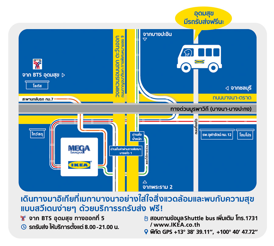 ดูจากแผนที่แล้วตรงวงแหวนหมายเลข 9 มีทางเข้า IKEA ตรงด่านช่างน้ำหนัก (เส้นเขียว) แล้วมีทางวิ่งไปกลับรถเข้า IKEA บางนา
