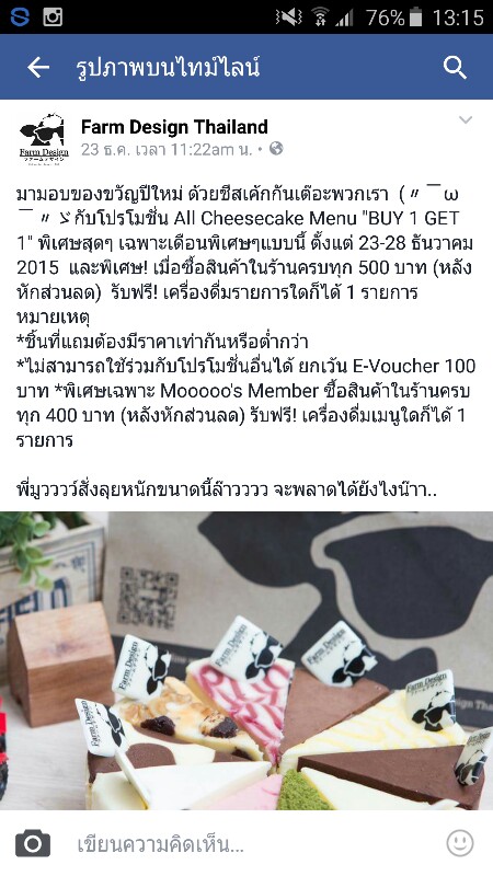 เราสะดวกวันนี้ พอห้างเปิดก็ไปที่ร้านที่เดอะมอลล์บางกะปิเลย ไปถึงตู้โล่งมาก พวกเค้กชีสไม่มี พนักงานรับโทรศัพท์ พอลองถามได้คำตอบว่า "หมดแล้ว" (ทั้งที่ห้างเพิ่งเปิด) เราถามต่อว่าจะมีมาเติมมั้ย ( ไม่มีมาเติมค่ะ)