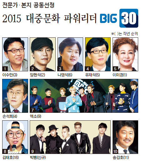 Survey ran by Herald Economy asked prominent industry officials from companies like CJ E&M, tvN, music agencies (SM, YG, JYP), etc on the top 30 pop culture leaders.