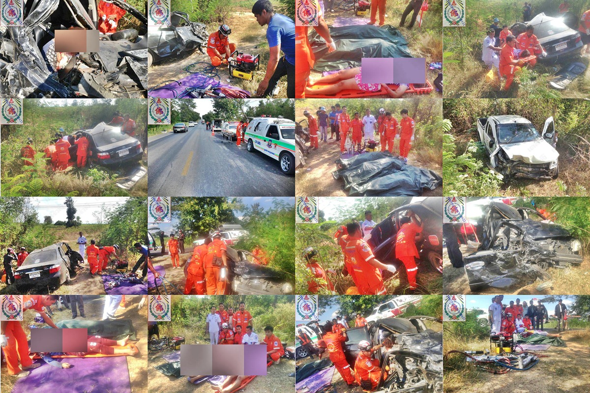 เมื่อวันที่ 28 ธ.ค. พ.ต.ท.อรุณบัวโค้ง พนักงานสอบสวน สภ.หินดาด อ.ด่านขุนทด จ.นครราชสีมา รับแจ้งมีอุบัติเหตุรถกระบะชนรถเก๋งมีผู้ได้รับบาดเจ็บ และเสียชีวิตหลายราย บริเวณหน้าโรงงานแป้งเม่งเซ้ง ถนนสายด่านขุนทด-ชัยบาดาล ไปตรวจสอบพร้อมด้วยหน่วยกู้ภัยฮุก 31 จุดอำเภอด่านขุนทด ที่เกิดเหตุพบรถกระบะ ดีแมคซ์ ทะเบียน 1 ฒณ 363 กท.ด้านหน้าและด้านข้างพังยับเยิน มีผู้บาดเจ็บ 4 ราย เป็นพ่อแม่ลูก ใกล้กันพบรถเก๋ง โตโยต้า วีออส สีดำ ทะเบียน 4 กฎ 6314 กท. สภาพพังยับเยิน หลังคายุบมีผู้เสียชีวิต 3 รายติดอยู่ภายในรถ เจ้าหน้าที่ช่วยกันนำร่างออกมา ทราบชื่อต่อมาคือ น.ส.บุศรา เที่ยงสันเทียะ อายุ 25 ปี น.ส.สุภาภรณ์ อ่อนเฉวียง อายุ 28 ปี และ น.ส.จิราพร อ่อนเฉวียง อายุ 25 ปี เป็นคนขับ