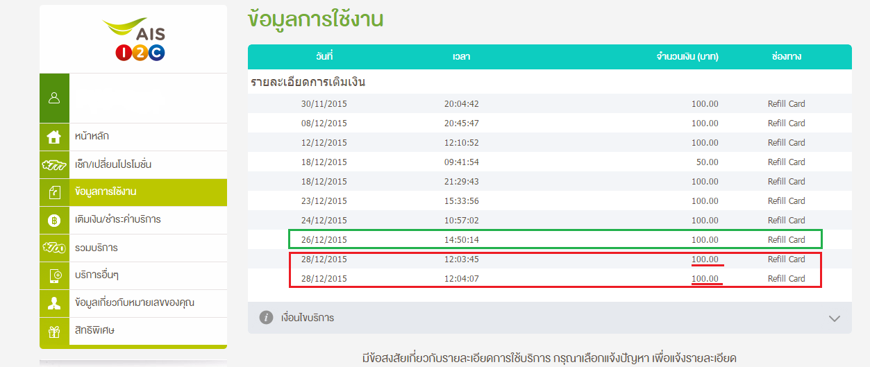 ตรวจสอบการเติมเงินในเว็บ สีเขียวคือเติมไป 100 วันที่ 26 สีแดงคือเติมเงิน 2 ครั้ง ๆ ละ 100 ตามเงื่อนไขที่ส่งมาใน sms