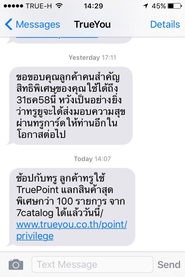 สมัครแพ็คเกจเน็ตเสริม ที่บอกว่าได้รับบัตรกำนัลสตาร์บัคส์ เดือนแรกก็ใช้งานได้ปกติดีกดลิงก์ก็จะผ่านไปรับสิทธิ์ที่แอปทรูแล้วก็กดรับสิทธิ์ในนั้นแต่เดือนถัดมาหลังจากต่ออายุอัตโนมัติและได้รับ SMS แจ้งเพื่อร