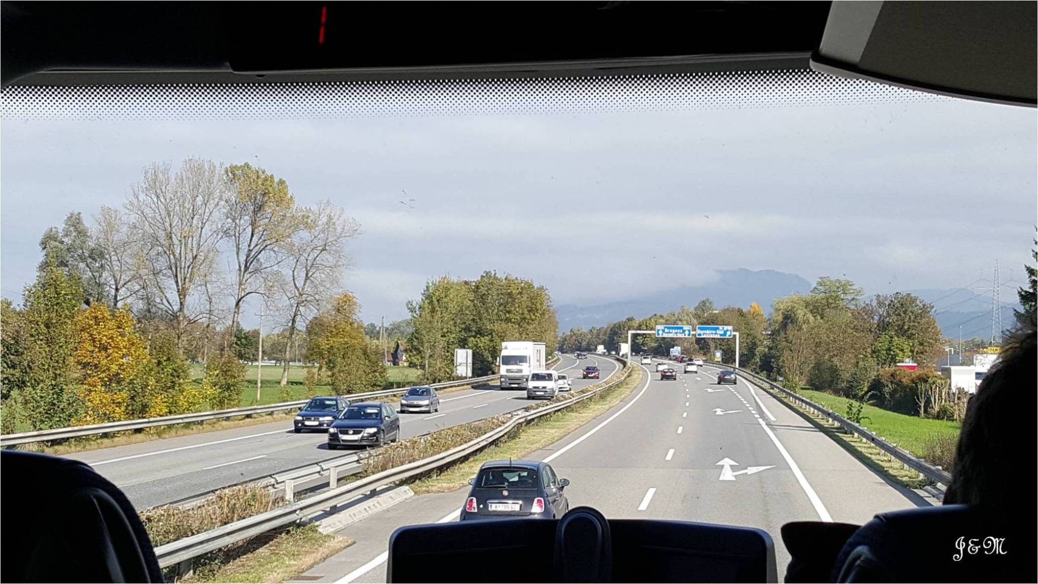 จากรูปจะเห็นได้ว่าถนนมีขนาดไม่ใหญ่มากฝั่งละ 2 เลนเท่านั้น แต่รถก็ไม่ติด เพราะว่ามีรถวิ่งกันไม่มากนัก ไม่มีรถติดหรือว่าต้องชะลอเป็นระยะทางยาวๆ เห็นแล้วน่าอิจฉาจริงๆ พวกเรานั่งเพลินๆ จนไม่ได้กินอะไรที่เตรียมมาเลยตลอดเส้นทางมีแค่ดื่มน้ำกันเท่านั้น รูปก็ถ่ายไม่ได้มากนัก เพราะรถวิ่งค่อนข้างเร็ว จนเวลาประมาณ 14:59 น. รถก็เลี้ยวเข้าสถานีขนส่งที่เมืองมิวนิคซึ่งอยู่ด้านหลังสถานีรถไฟหลักของเมืองมิวนิค München Hauptbahnhof แบบเยอรมัน หรือ Munich Hauptbahnhof แบบคุ้นปากคนไทย รถมาจาดด้านนอกอาคารเพราะภายในค่อนข้างแน่น ที่นี่ดูเป็นสถานีขนส่งมากกว่าที่ ซูริค เมื่อตอนเช้าเพราะว่ามีอาคาร และช่องจอดในร่มเรียงเป็นตับ คล้ายๆ กับขนส่งหมอชิตที่ไทย ลงจากรถแล้วไปรับกระเป๋าเดินทางด้านหลังรถ คุณพี่แกไม่เห็นจะดูกระดาษแผ่นเล็กๆ ที่ให้เรามาเลย ยกลงมาวางแล้วเจ้าของกระเป๋าเขาก็มาลากกันไปเอง สุดท้ายเหลือของพวกเราที่อยู่ด้านในสุด และหนักที่สุด (มั้ง) เมื่อตอนยกขึ้นช่วยคุณพี่คนขับยกตอนยกลงเลยต้องช่วยยกลงเหมือนเดิม ขอบคุณคุณพี่แกแล้วก็เข็นกระเป๋าออกมา