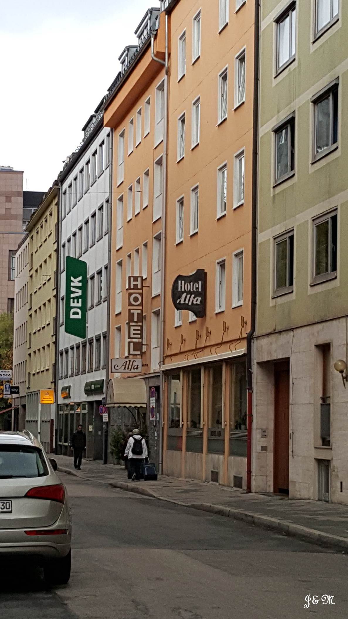 ไปเที่ยวคราวนี้มีแฟ้มเอกสารคู่ชีพที่ใช้บรรจุใบจองโรงแรม จองรถไฟ รถบัส แผนที่ ตั๋วเครื่องบิน สวิสพาส นั่นนี่เต็มแฟ้มอยู่ 1 อัน มีกระทั่งสำเนาพาสสปอร์ต บัตรประชาชน รูปถ่ายสำหรับติดบัตรของทุกคน รวมทั้งเอกสารต่างๆ ที่ได้รับมาในช่วงที่ไปเที่ยว ผมต้องหลบมุมเพื่อนำเอกสารการจองโรมแรมออกมาเพื่อดูทิศทางก่อนว่าออกมาถูกทางหรือเปล่า แต่ด้วยความที่ภรรยาเชี่ยวชาญเรื่องทิศทาง และแผนที่ของโรงแรมต่างๆ เพราะว่าภรรยาผมเป็นคนเช็คตำแหน่งโรงแรมว่าสะดวกกับการเดินทางไปยังสถานที่ท่องเที่ยวต่างๆ ภายในเมืองนั้นมั้ย เลยส่งแผนที่ให้ภรรยาผมดู จากนั้นพอมองออกว่าพวกเราออกมาถูกทางแล้วแค่ตรงไปเลี้ยวซ้าย และเลี้ยวขวาก็ถึงแล้วพร้อมกับชี้มือชี้ไม้ประกอบกันไป ระหว่างนั้นมีผู้หญิงชาวเยอรมันมาสอบถามว่ามีอะไรให้ช่วยมั้ยพวกเราก็ไม่อยากขัดศรัทธาเลยส่งแผนที่ให้เธอดู ปรากฎว่าเธอก็ยืนยันว่าสิ่งที่เราคิดกันนั้นถูกต้องแล้วโรงแรมไปทางที่พวกเราคิดไว้จริงๆ เลยได้โอกาสในการเผยแผ่วัฒนธรรมไทยโดยการขอบคุณแบบไทยๆ ไป พวกเรา 3 คนเดินเข็นกระเป๋าออกจากสถานีรถบัสข้ามรางรถราง และถนนมาสักประมาณ 700 เมตรก็ถึงโรงแรม Hotel Alfa Munich ที่จองไว้