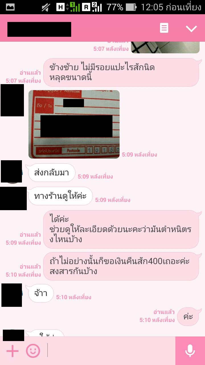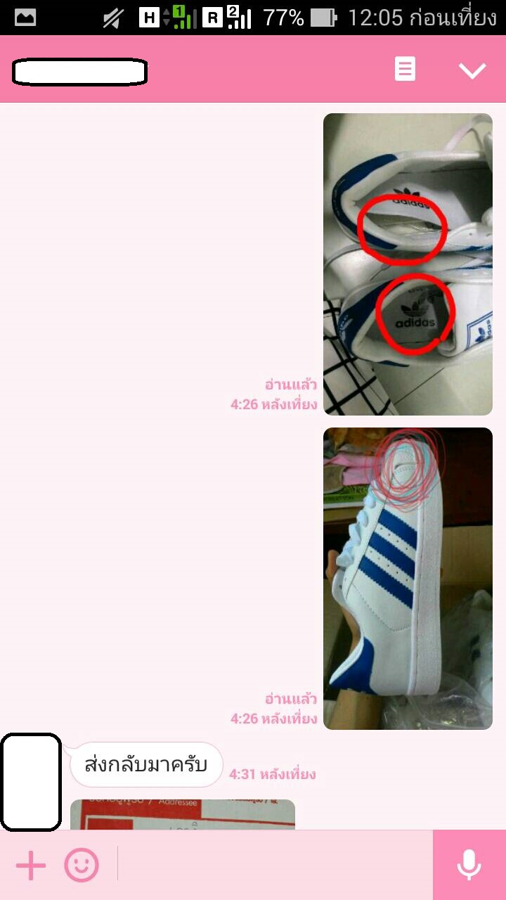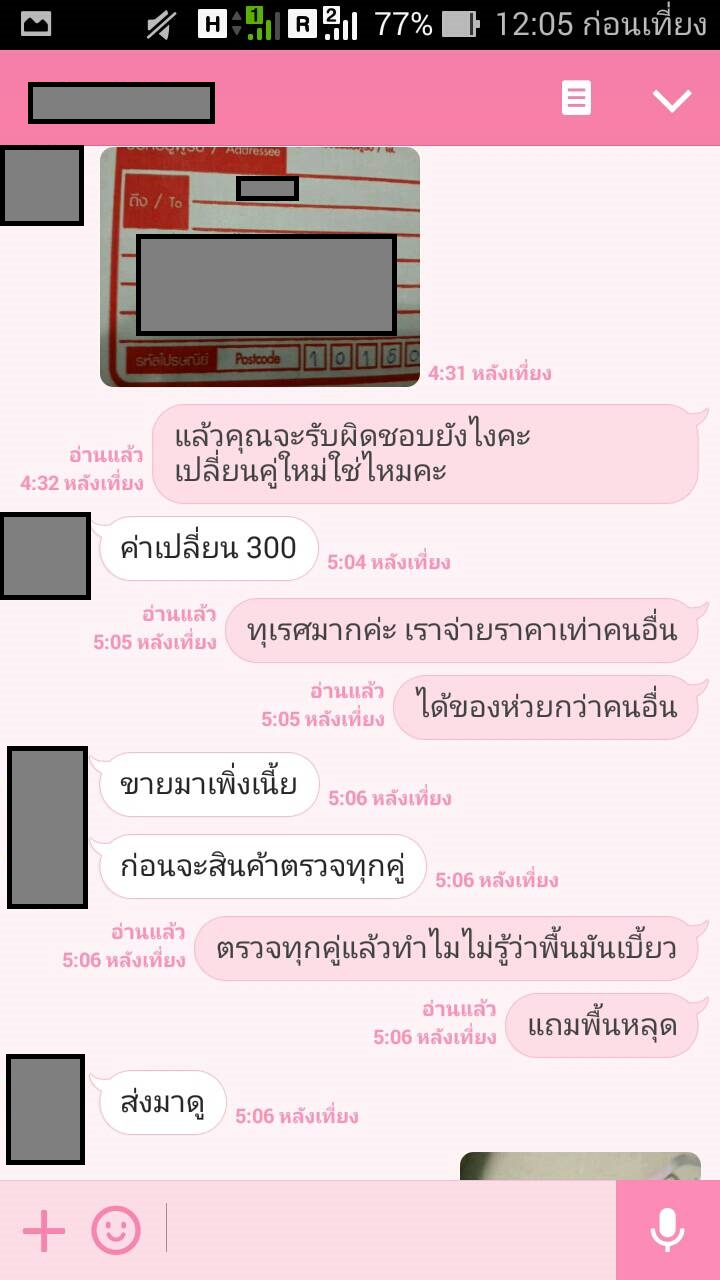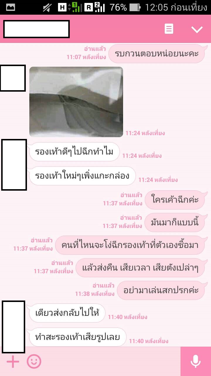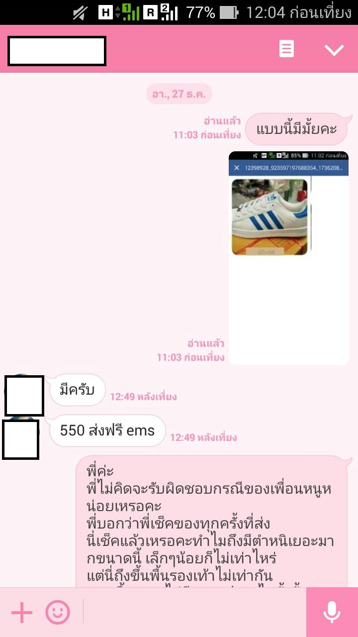 เราจึงใช้ไลน์ของเพื่อน เจรจากัน ผลที่ได้คือเค้าจะให้ส่งกลับไปให้ดูค่ะ เราจึง ems รองเท้ากลับไป อีก 80 กว่าบาท เสียไปจะเกือบ 700 แล้ว ยังไม่ได้รองเท้าเลยค่ะ ทางเจ้าของ บอกจะเช็คให้ ทางเราก็เลยส่งเลขไปและบอกไปว่า ถ้าได้รองเท้าแล้ว ให้ทักมาด้วย