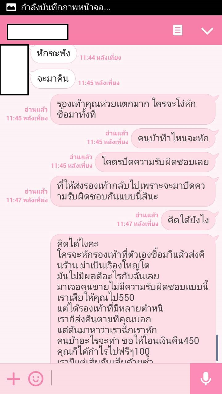 แล้วเจ้าของร้านก็ไม่ตอบกลับมาอีกเลยค่ะ แล้วจะส่งคืนมาให้เรา เรางงมากว่าเราจะบ้าไปฉีก บิดรองเท้าให้พังทำไม