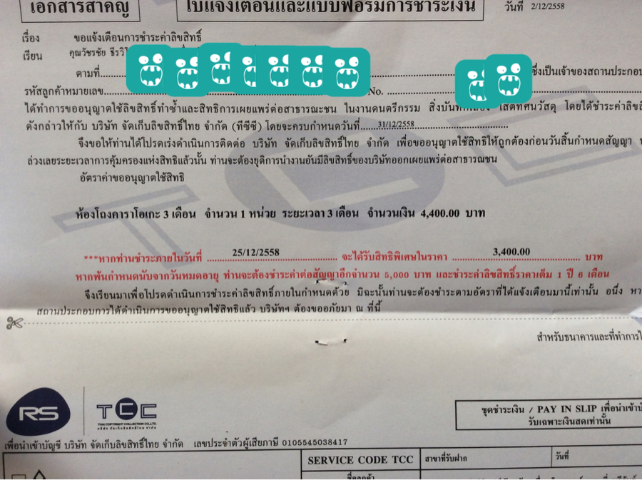 คือทางร้านได้ใช้บริการคาราโอเกะของ RS มาเป็นเวลานานและจ่ายค่าลิขสิทธิ์ตลอด แต่ทุกครั้งที่ต้องจ่าย ในใบแจ้งจะมีกำหนดว่าให้จ่ายก่อนวันที่ 25 ถ้าหลังจากนั้น จะต้องจ่ายเพิ่มอีก 1000฿ และถ้าหลังจากเดือนนั้นถ้าไม่จ่าย ต้องจ่ายค่าต่อสัญญา 5000฿ + ค่าลิขสิทธิ์ราคาเต็ม 1 ปี 6 เดือน อีกด้วย