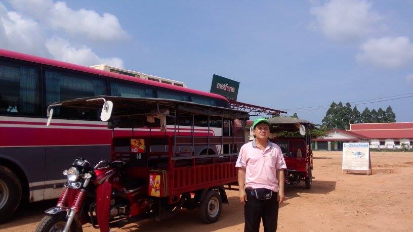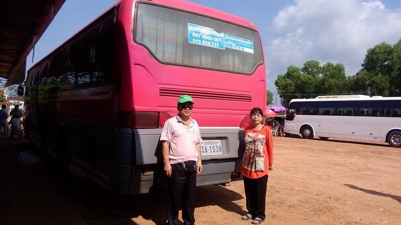 รถออกจากบริษัท Phuong Trinh Cambodia ใกล้สนามกีฬาพนมเปญ เวลา 6.05 เด็กรถพอพูดภาษาไทยได้บ้าง พอคุยกันรู้เรื่อง ไปติดที่ท่าข้ามฟาก Neak Loeung Ferry ตั้งแต่เวลา 7.45-10.15 น. จึงได้ขึ้นโป๊ะข้ามฟาก รถต่อแถวยาวหลายกิโลเมตร ผู้โดยสารต้องหาซื้ออาหารข้างทางรองท้อง เราเกือบอดตายซะแล้ว เงินเรียลเราเหลือนิดเดียว คิดว่าไม่มีเรื่องใช้แล้ว พอซื้อขนมรวงผึ้งได้คนละชิ้นพอดี แค่พอประทังหิว ลุงไปหาที่ยิงกระต่ายตามซอกตามมุมริมทางสบายๆ แต่กว่าป้าจะหาที่ขอเข้าห้องน้ำจากร้านค้าแห่งหนึ่งริมทาง ก็ต้องนั่งบิดจนหน้าเหลือง